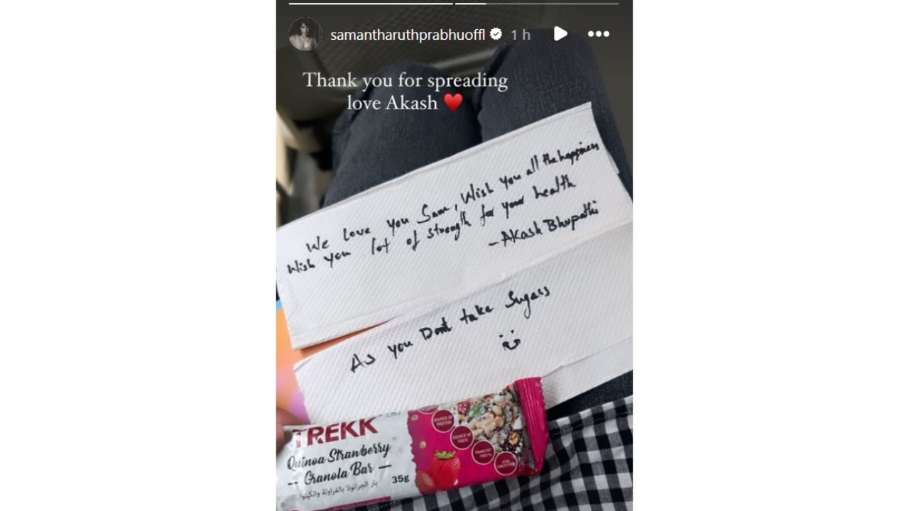 samantha Ruth Prabhu recently shared a photo of a unique message that was scribbled on a sheet of paper and given to her by a fan called Akash. Because