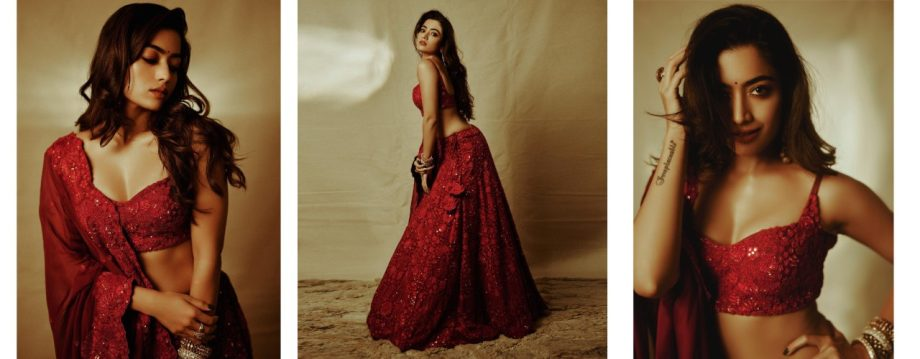 Rashmika looks gorgeous with a side tassel and floral embroidery on her crimson, high-waist flared lehenga. She accessorizes her look with a similar sleeveless blouse that has a backless back and a deep neckline in the front, giving it a glamorous touch. An embellished dupatta with cutouts of flowers completes the look. To accentuate her regal and sophisticated image, she accessorizes with gold jewelry, arranges her look with wavy open tresses, and applies stunning makeup, including red lips.