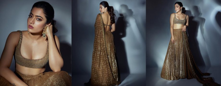 In a golden shimmering pleated flared lehenga and dupatta, rashmika mandanna looks gorgeous. She wore it with a strappy, backless, sleeveless blouse that matched and had a deep square front neckline. It's an elegant decision that offers a hint of sophistication and grace. The actress accessorized her appearance with a fluffy ponytail, an open haircut with waves, brown-hued makeup, creamy pink lips in contrast, and accessories. Her rings and earrings combine to create a stunning ensemble that accentuates the lehenga and gives it an air of ethereal appeal.