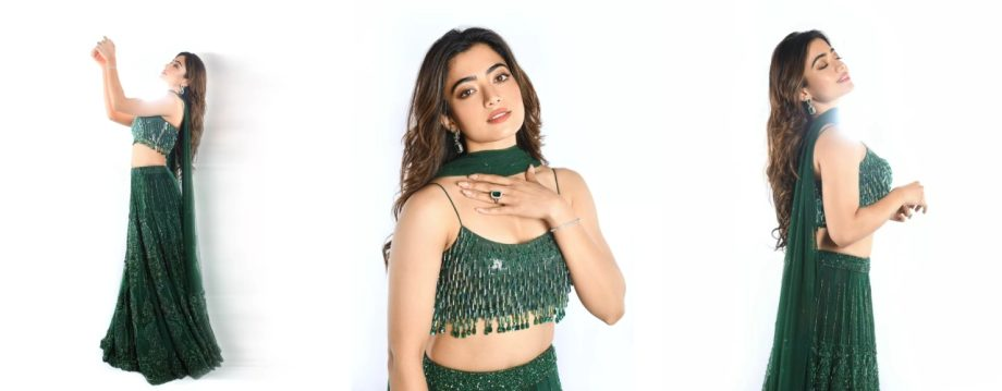 In a green lehenga, rashmika mandanna looks gorgeous. The ensemble consists of a floor-length lehenga with a flared design adorned with threadwork and a blouse that matches and is tasseled all over. The U-neckline and spaghetti straps of the blouse give the classic style a modern update. She accessorizes her look with a touch of elegance and modern flare, sporting a wavy open haircut, gorgeous makeup with peach matte lips, and accessories with silver and green stonework.