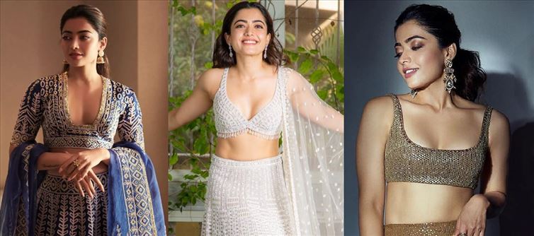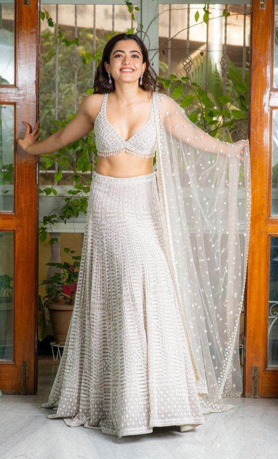 Rashmika Mandanna looks gorgeous in a floor-length, white lehenga with elaborate embroidery around the waist. She accessorizes it with a transparent dupatta and a similar blouse that accentuates the back and adds a modern, sophisticated touch. The blouse has a sleeveless deep-leaf neckline and a tassel attached to the hemline. The actress makes a classy and stylish statement with her pink makeup, open waves in her hair, and sparse accessories.