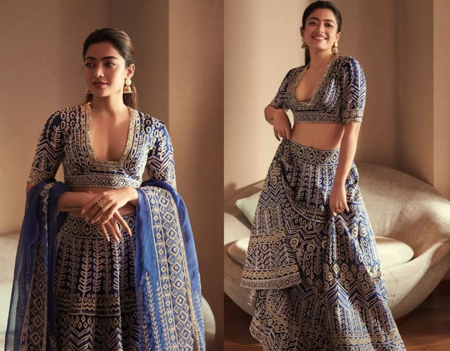 Rashmika Mandanna, a South indian supermodel, looks stunning in a blue flared lehenga with handwoven embroidered threadwork, a matching top with a front plunge square neck half-sleeve embroidery shirt, and a transparent dupatta bordered in white threadwork. The actress accessorizes her outfit with gold jhumkas and a ring that goes well with your lehenga and offers a sophisticated, fashionable touch. Her sleek half-tied hairdo and peach matte lip complete her look.