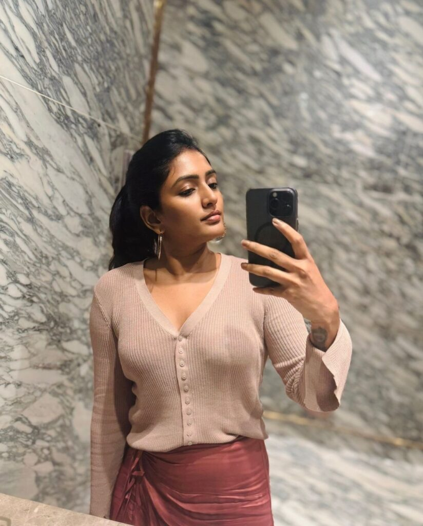 The gifted actress showcased her easy appeal in a casual yet stylish ensemble in a set of pictures she posted on social media.Eesha Rebba's exquisite skin was accentuated by her chocolate-colored skirt and cream-colored top. She added some refinement to her ensemble by wearing hoop earrings as an accessory and wearing her hair in a high ponytail.