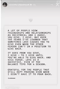 "A lot of people view friendships and relationships as reciprocal and I agree. You give. I give. But over the years, I've learned that sometimes love causes you to give even when the other person isn't in a position to give back. It goes from you give, I give - to I give until you're able to give back. And vice versa. love is a sacrifice. Even if the balance tips for a season. Grateful for the people that still kept pouring even when I didn't have it to pour back."