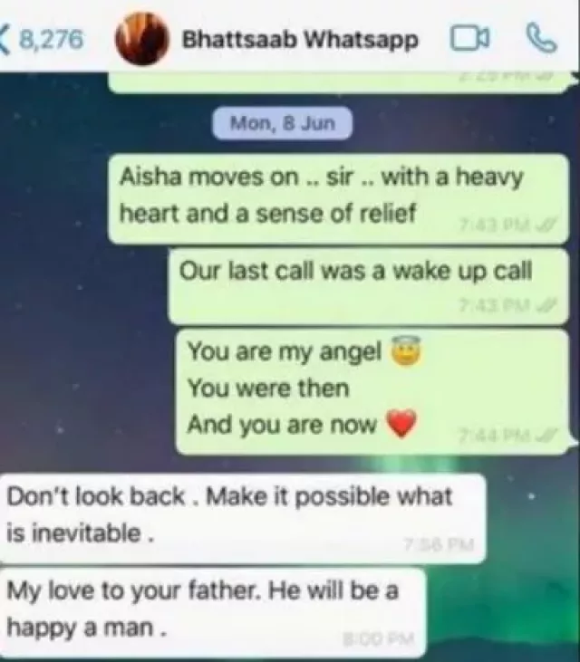 In the chat, she addressed herself as Aisha and wrote, “Aisha moves on..sir..with a heavy heart and sense of relief.’ In response to her, mahesh bhatt replied, “Our last call was a wake up call. You are my angel You were then And you are now. Don’t look back. Make it possible what is inevitable. My love to your father. He will be a happy man.” Rhea again responded back to him and penned, “You ve again unclipped my wings, twice in one life is almost God-like".