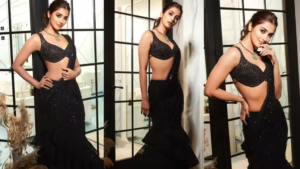 Pooja attracted heads once more with her shimmering black sequin saree. The actress gave a traditional look a contemporary spin by dressing in this timeless black saree, which upped the elegance factor.