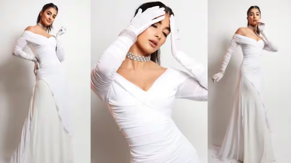 Pooja Hegde was on the list of celebrities who looked the best dressed when she wore an ivory off-the-shoulder gown with a plunging neckline, gathered front design, flowing skirt, and floor-sweeping train, evoking feelings of a Disney princess.