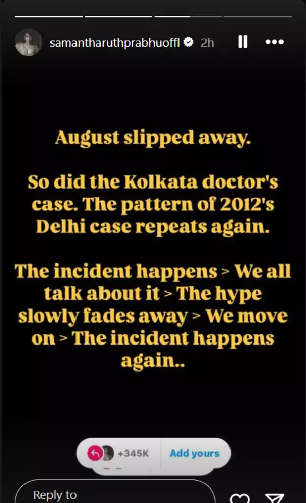 Samantha has now reminded everyone of the value of justice in the kolkata case by posting a message on her instagram stories. On a dark background, samantha posted a message that said, "August slipped away." The doctor's case from kolkata also did. The delhi case from 2012 follows the same trend once more.