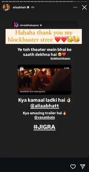 Alia Bhatt took to social media to share the teaser with her followers, and fellow actress Shraddha Kapoor also chimed in, sharing her excitement. Posting on her instagram stories, Shraddha wrote, “Ye toh theater me bhai ke sath dekhna hai, Kya kamal ladki hai @aliabhatt, kya amazing trailer hai.” alia playfully responded, “Hahaha thank you my blockbuster Stree.”