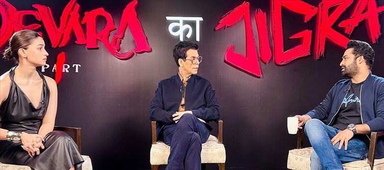 Alia Bhatt and karan johar are seen promoting their movie together in this cross-promotion of Jr. ntr by having a talkative interview. Devara: Part 1 is planned to visit cinemas on 27 september and Jigra will be released on 11 October. koratala siva intends to release Devara: Part 1 across India.