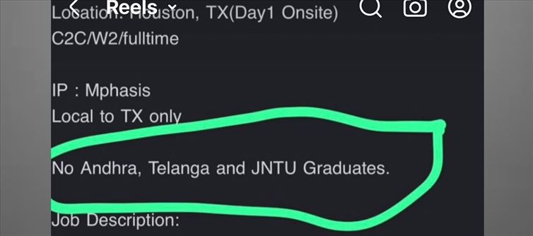 Since the united states opened its doors to Master's students following the COVID-19 pandemic, a large number of students have arrived and are finding it difficult to remain in the country. Those who are fortunate enough to be selected in the H1B lottery are under pressure to find employment. A screenshot of a job post is making the rounds on WhatsApp, but we were unable to confirm its veracity. An employer in Mphasis, texas posted a Java job posting that specifically states, "No Andhra, Telangana, and JNTU graduates." This is blatant discrimination, and if someone files a lawsuit, the business faces jail time.