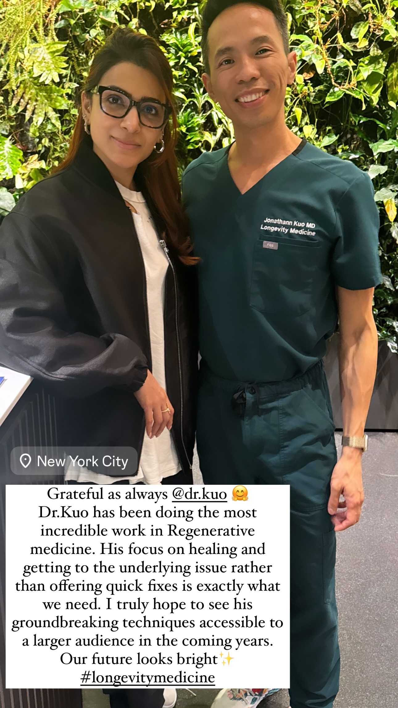 samantha Ruth Prabhu shared a peek into her vacation to New York on social media. Meeting Dr. Jonathann Kuo on her tour, the Citadel actor lauded his "incredible" work in regenerative medicine. In addition,