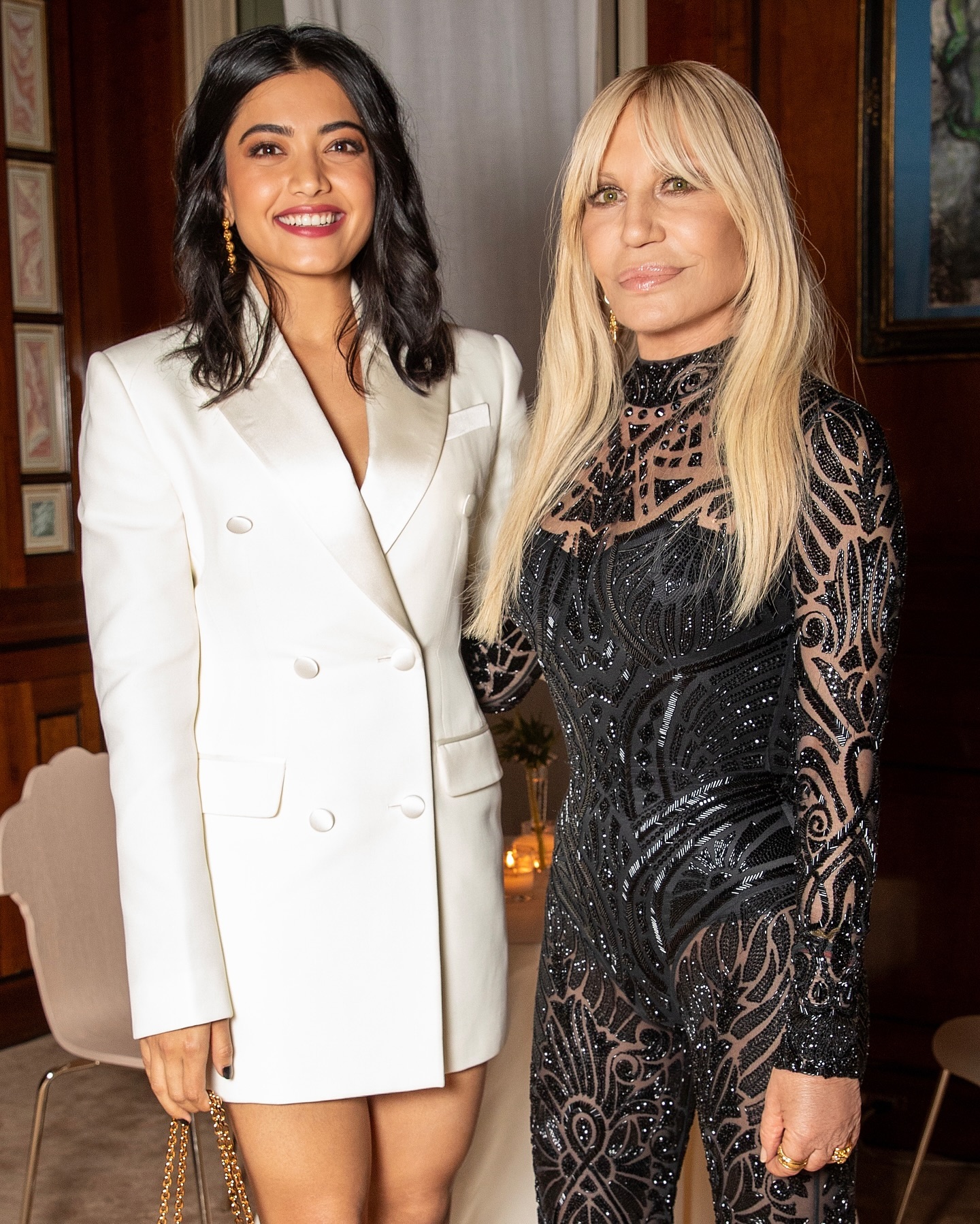 Donatella Versace shared a series of photos on instagram that captured some memorable moments from the after-party. However, the picture on the carousel where she and rashmika mandanna were in the same frame caught our attention. rashmika looked stunning in an ivory blazer dress that shouted "chic" from a mile and a half away for the glamorous occasion. The ensemble had long sleeves, voguish coat pockets, squared, well-padded shoulders, and fashionable lapels. rashmika looked effortlessly stylish in the outfit.