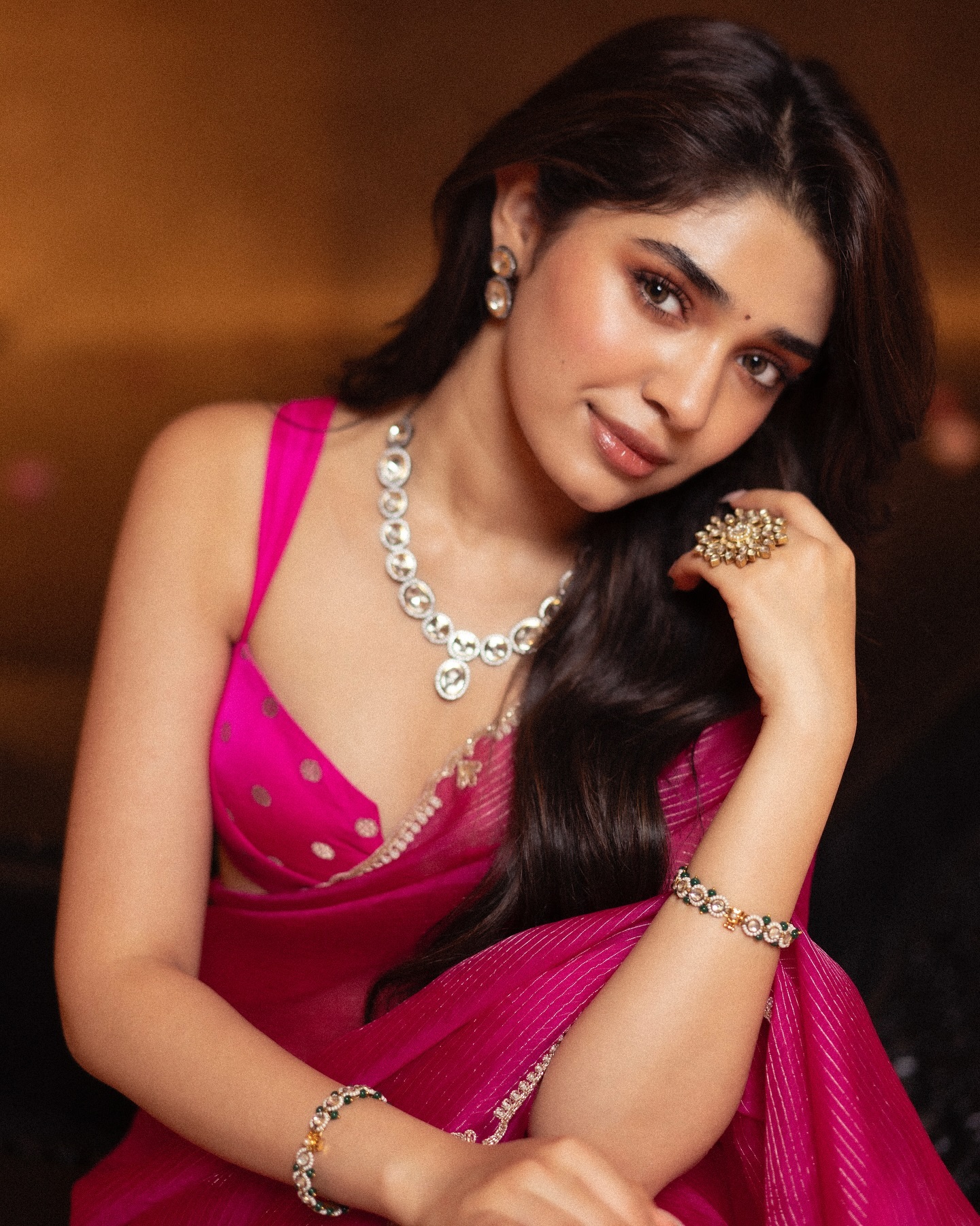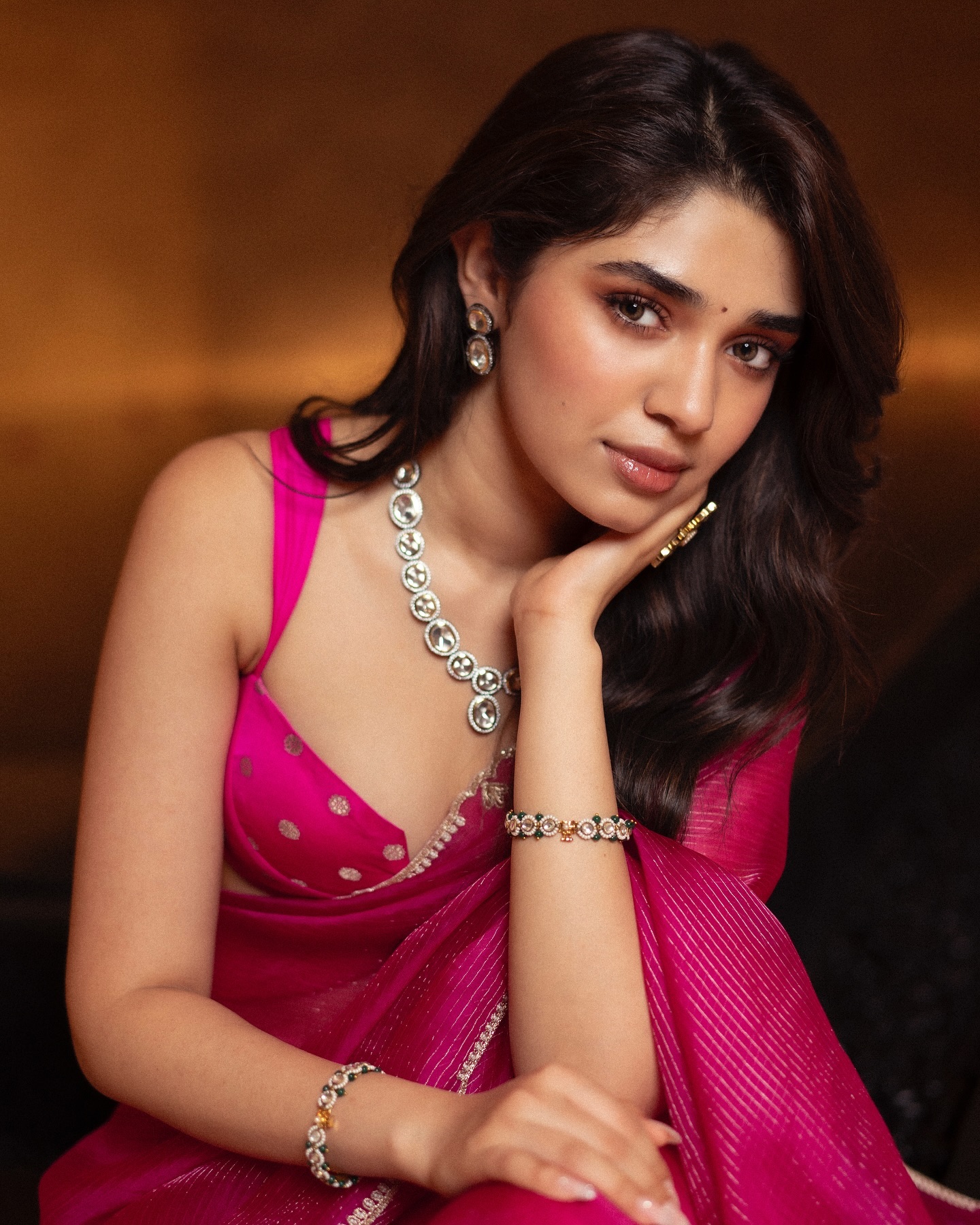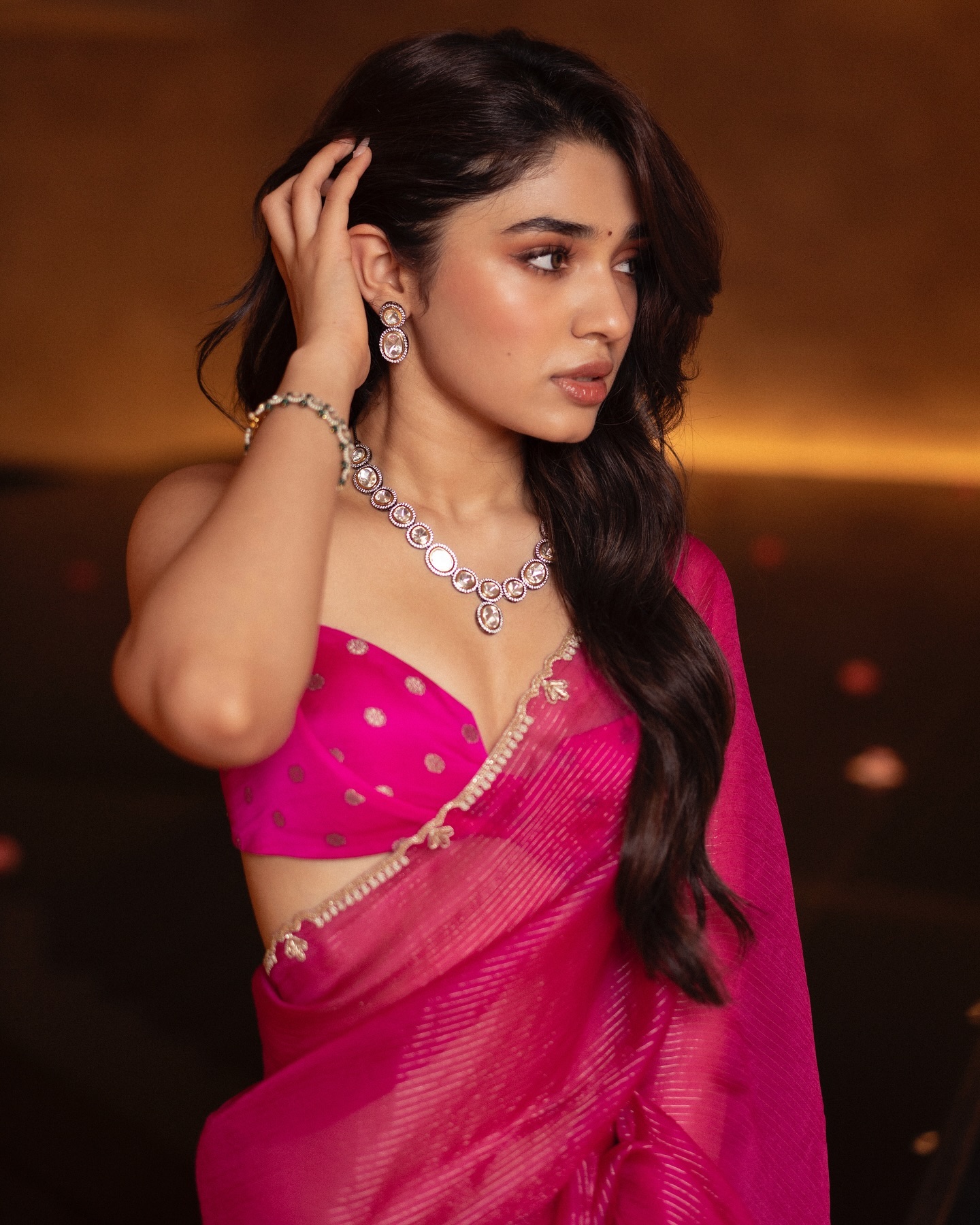 pink saree and a sleeveless top. The classic saree and contemporary blouse combined to offer the ideal mix of sophistication and edge. She accessorized with bangles, a bindi, open hair, matching earrings, and a stunning diamond necklace to finish the ensemble. The entire impact was simply amazing.