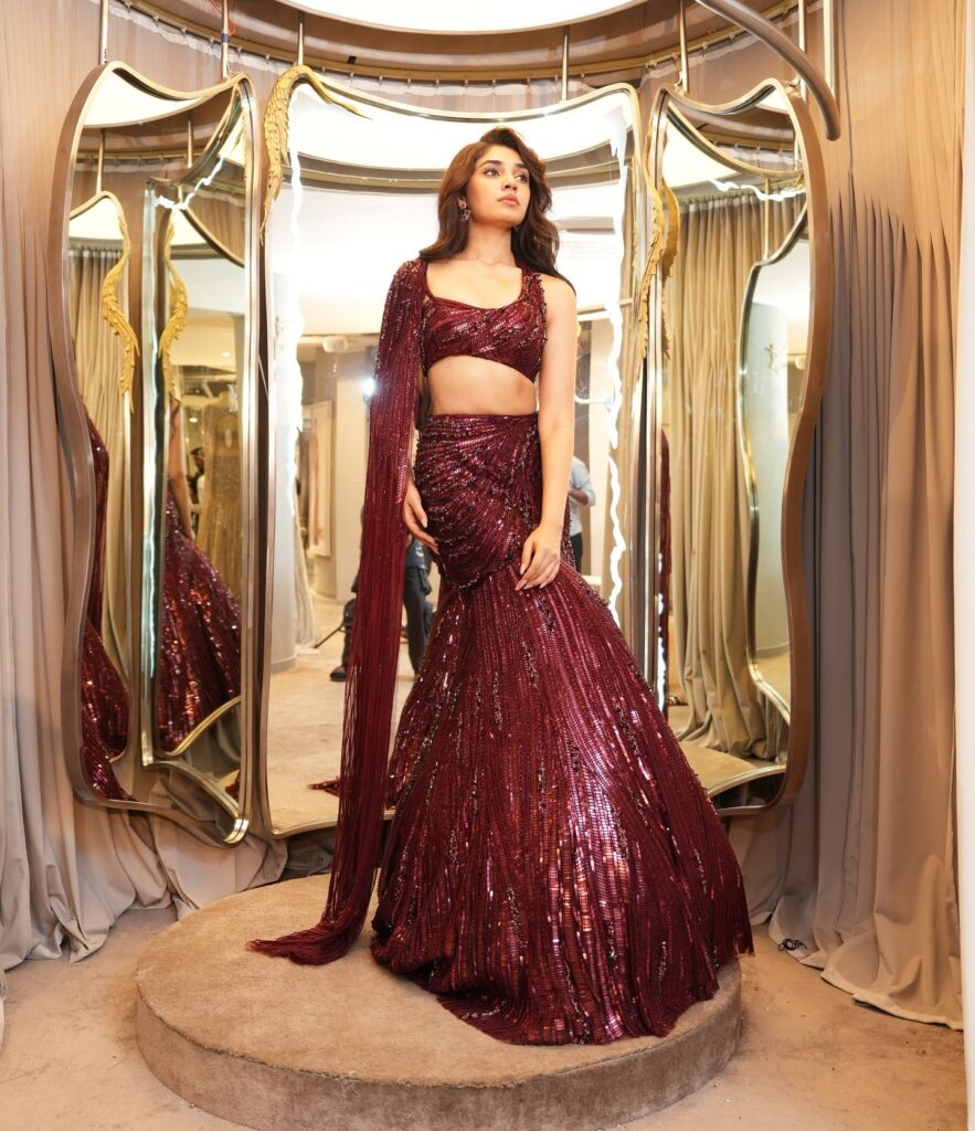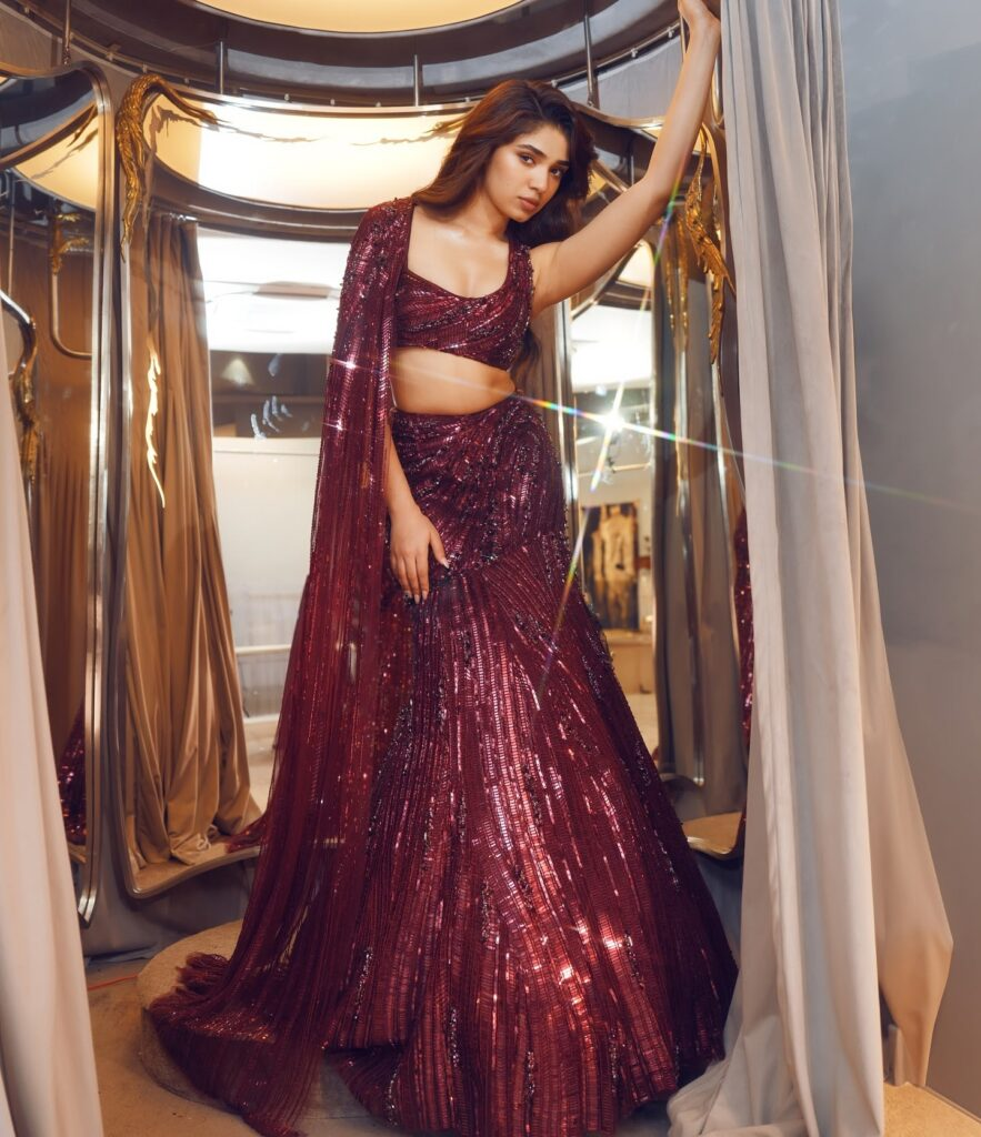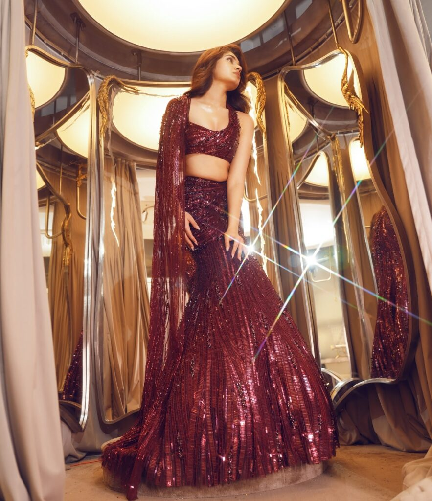 beauty in this stunning lehenga with a dramatic long train, worn with a magnificent maroon blouse. Her dress's sequined accents shimmer exquisitely, enhancing the glitz of her entire appearance. Her self-assured manner and captivating grin make her an amazing sight!