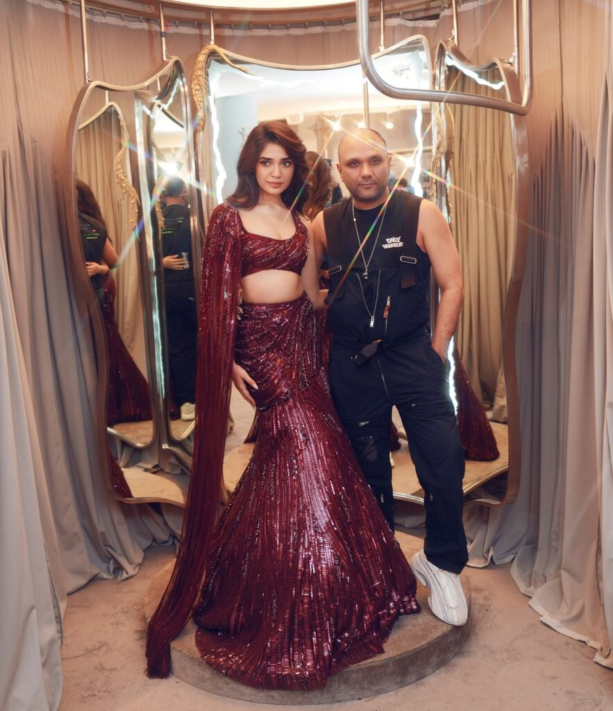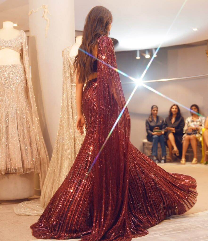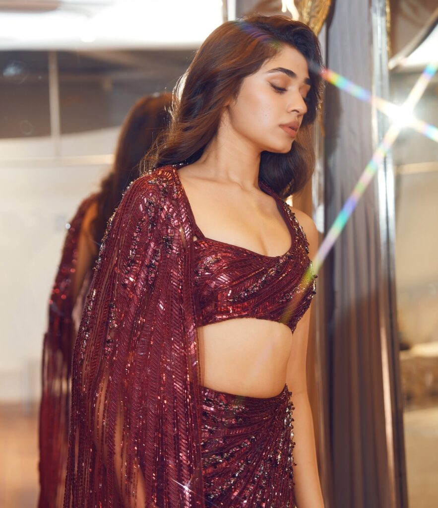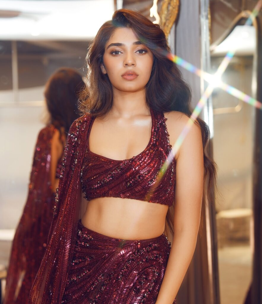 beauty in this stunning lehenga with a dramatic long train, worn with a magnificent maroon blouse. Her dress's sequined accents shimmer exquisitely, enhancing the glitz of her entire appearance. Her self-assured manner and captivating grin make her an amazing sight!