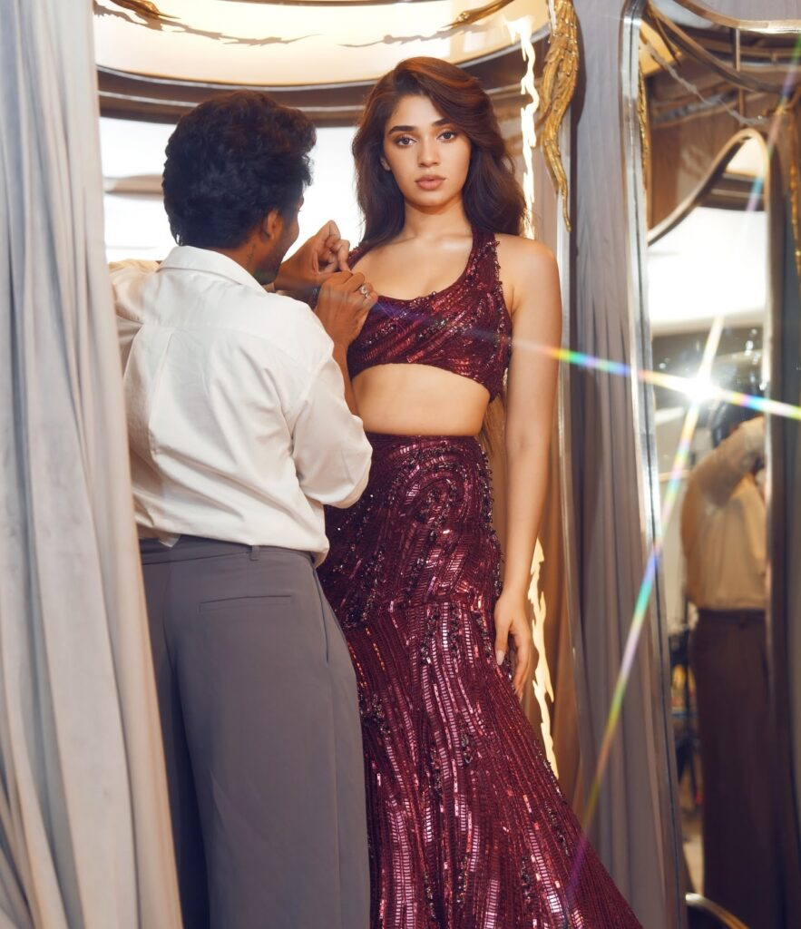 fashion while balancing her endearing youthfulness. Her skin is exquisitely highlighted by the maroon colors, which makes this ensemble ideal for any celebratory occasion or red-carpet event.