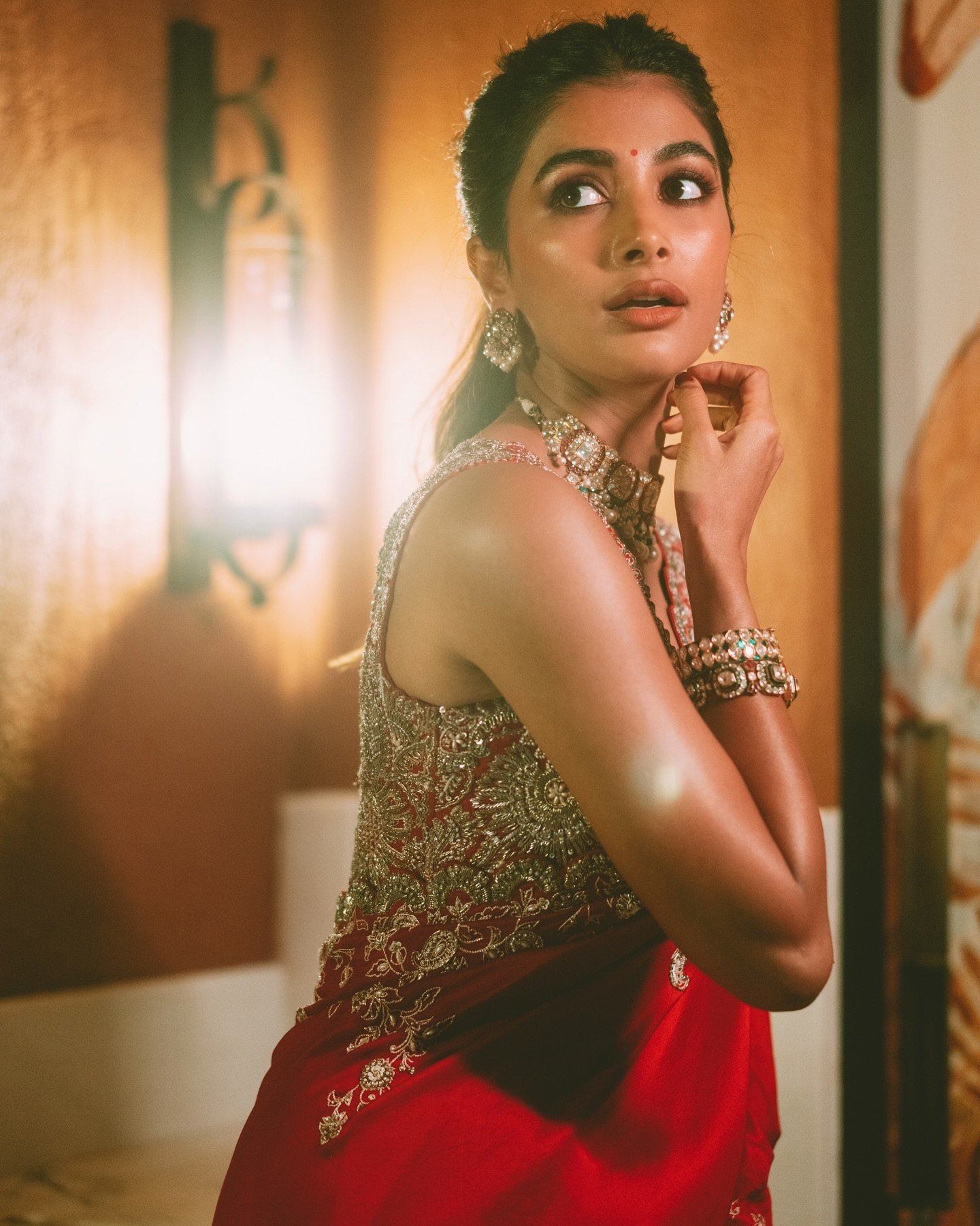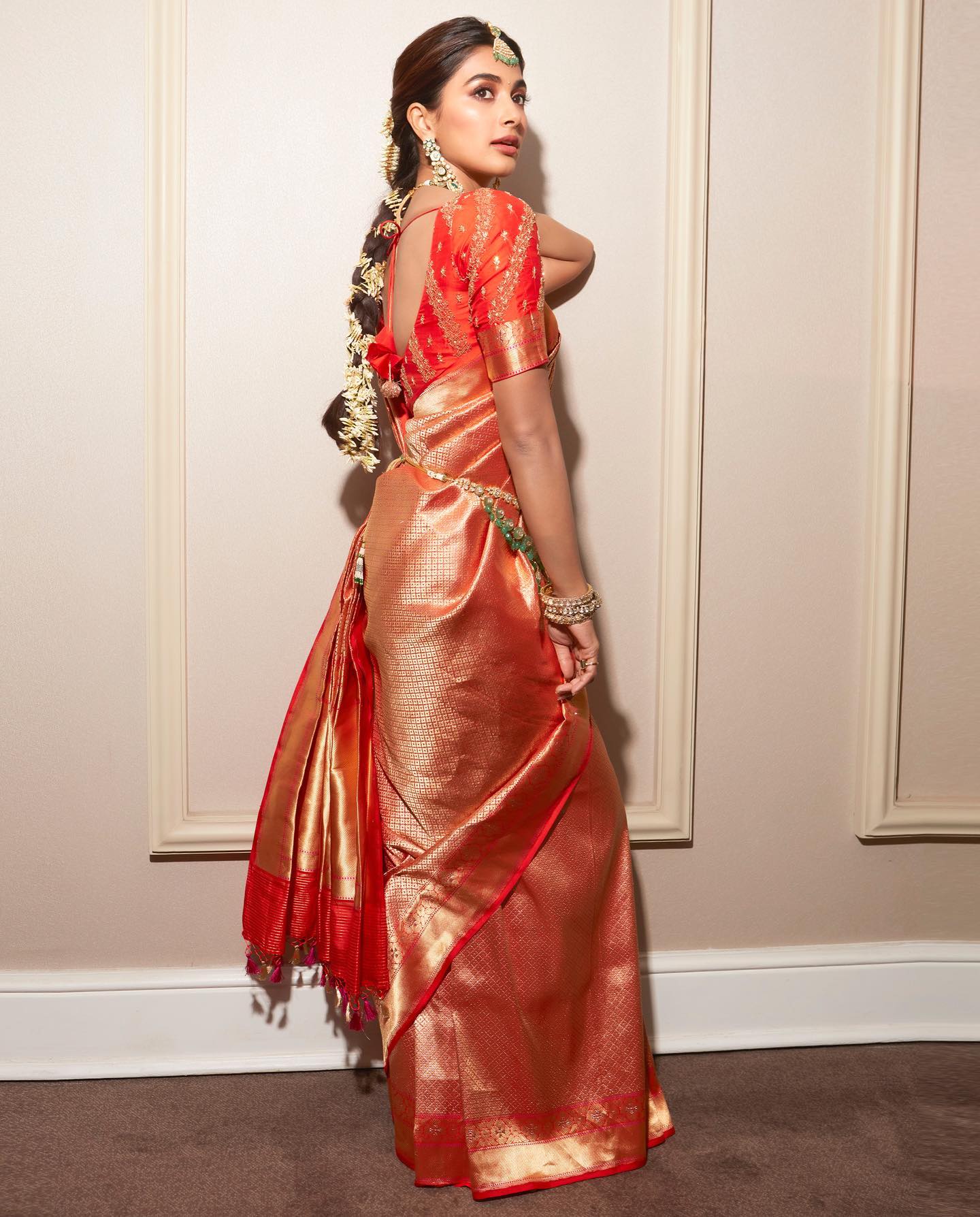 Pooja looked stunning in a traditional silk saree in shades of orange and
