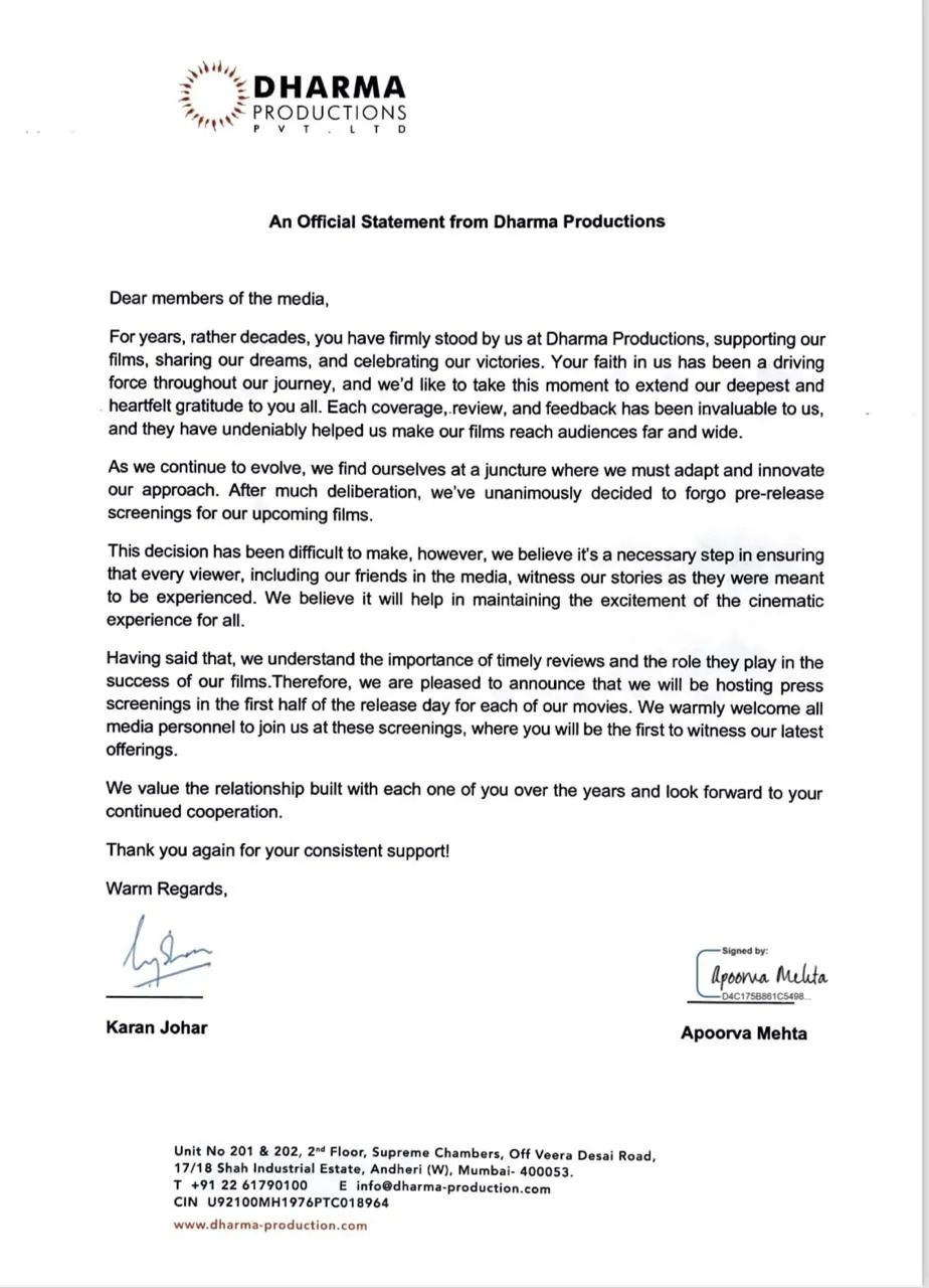 Karan Johar and apoorva mehta have stated that they would no longer be doing pre-release screenings for their films in an open letter to the media. The two sent their sincere gratitude to the media for their unwavering support and the beneficial influence they have had on their films. The letter goes on to clarify that the decision was made with the intention of offering the media and viewers an unbiased, open-minded approach free from any pre-emptive judgments and critiques.