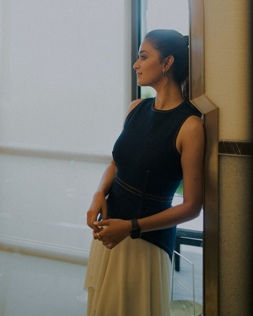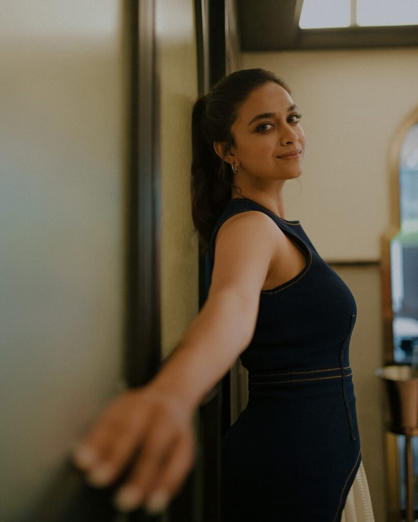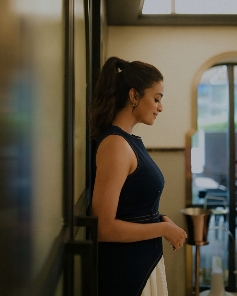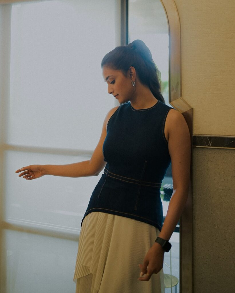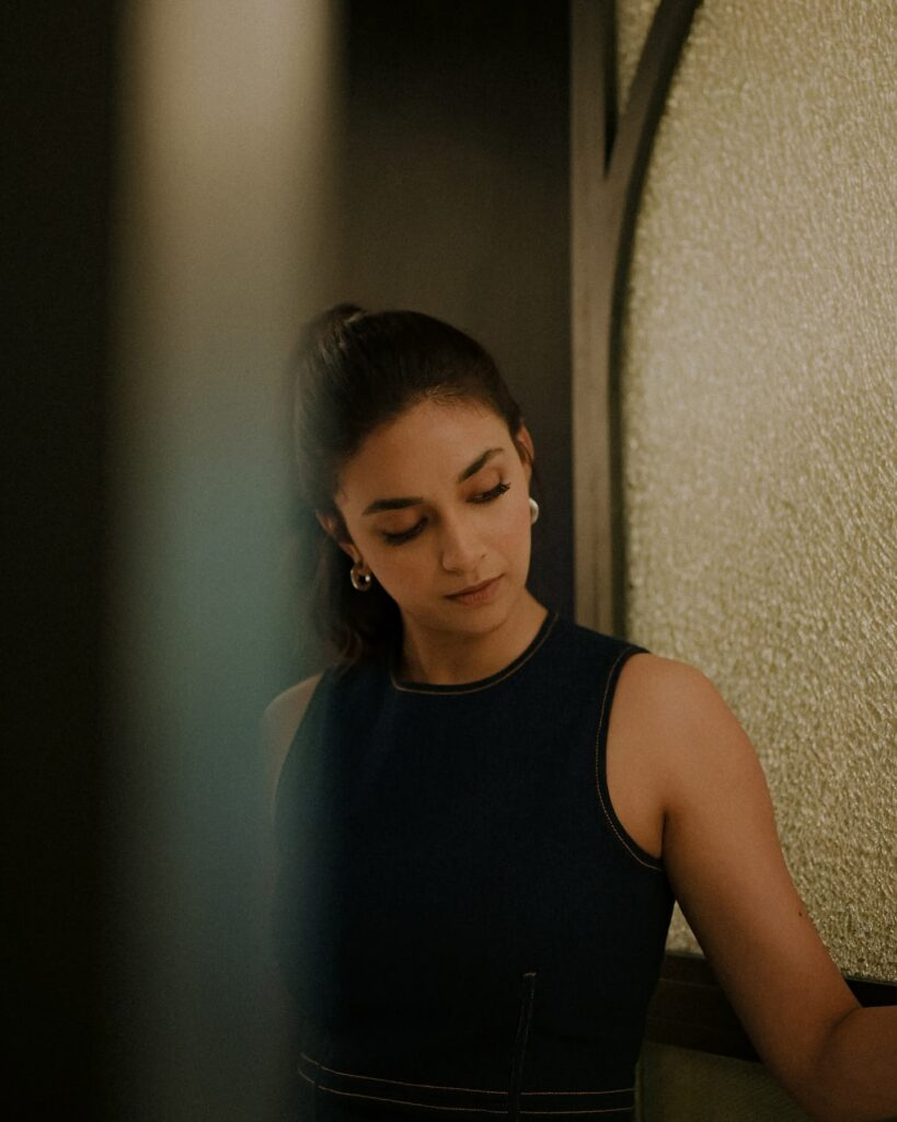 Keerthy looked effortlessly put together, sporting a denim shirt with a distinctive white flair accent at the bottom that mixed casual style with a hint of elegance. Her attire stood out because of the white flair, which gave the otherwise basic denim appearance a classy edge.