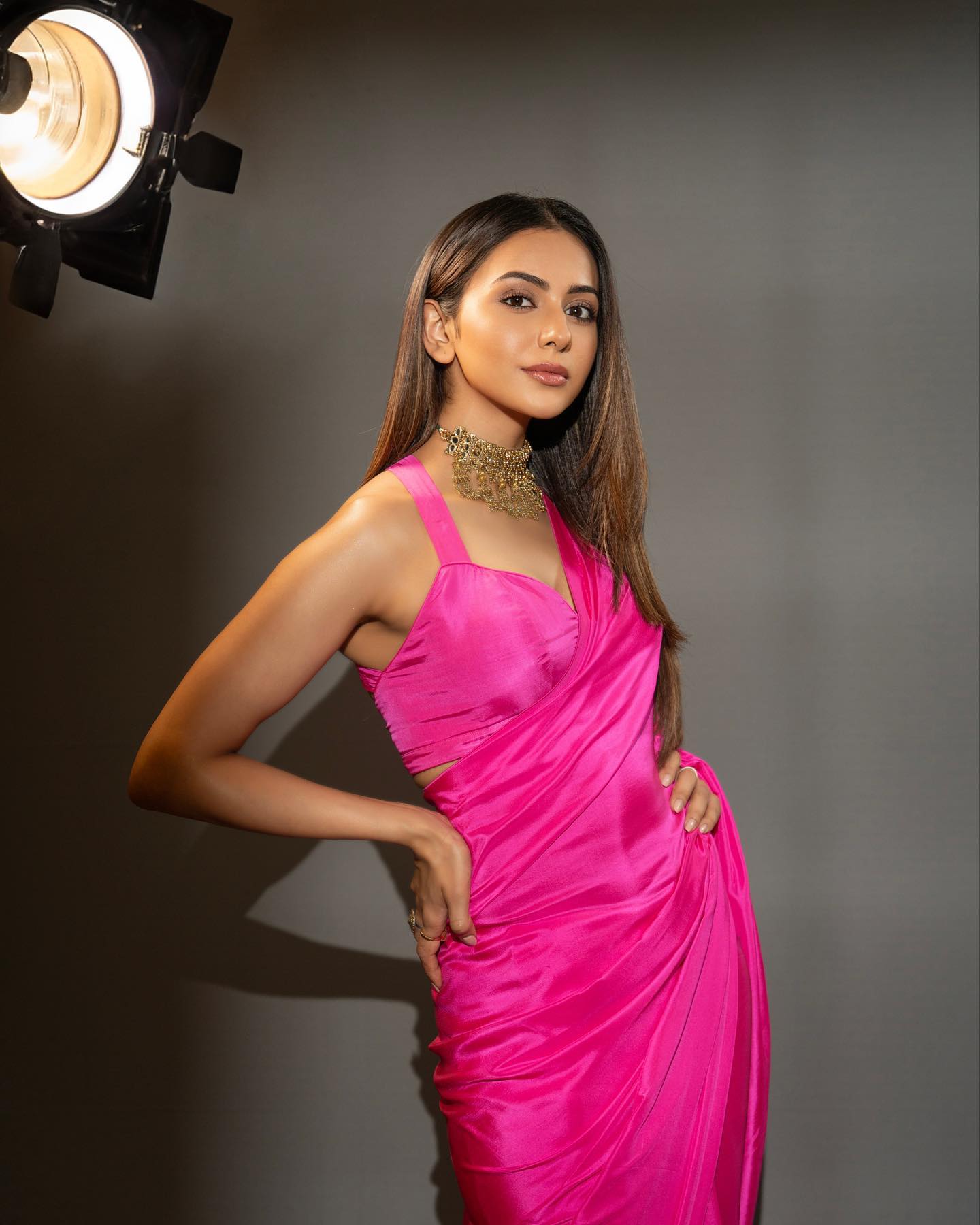 Rakul Preet's monochromatic pink saree ensemble is a match made in heaven if pink is your favorite color and you want a minimalist style. For your next brunch date, you must have this airy satin saree from Ekaya Banaras. You'll turn your attention if you wear it with a bold necklace and a matching sleeveless blouse!
