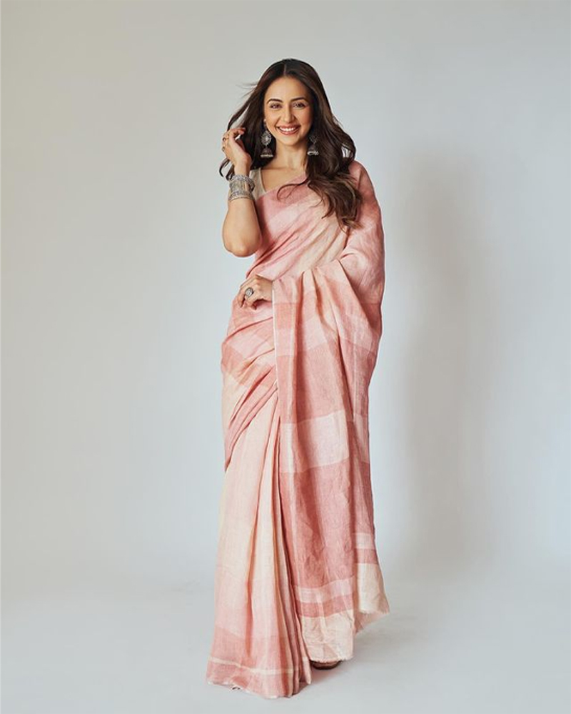 This blush pink Karanj checkered handmade linen saree from the apparel company Anavila is her most recent pick, and it's perfect for summer. To combat the intense heat and maintain her gorgeous appearance, the actress wore it with a silver Zari sleeveless top.