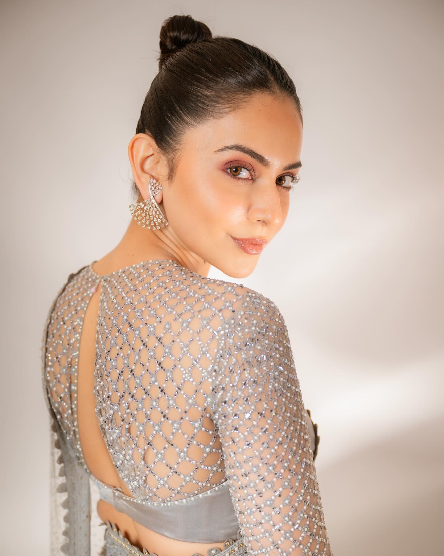 Rakul Preet Singh made another excellent pick with this sheer silver saree. Choose this mesh saree she wore with a transparent embroidered full-sleeve blouse if you have a summer celebration coming up. The blouse and saree's sheer quality would keep you cool even if it was full-sleeved, and it would also make you appear stunning.