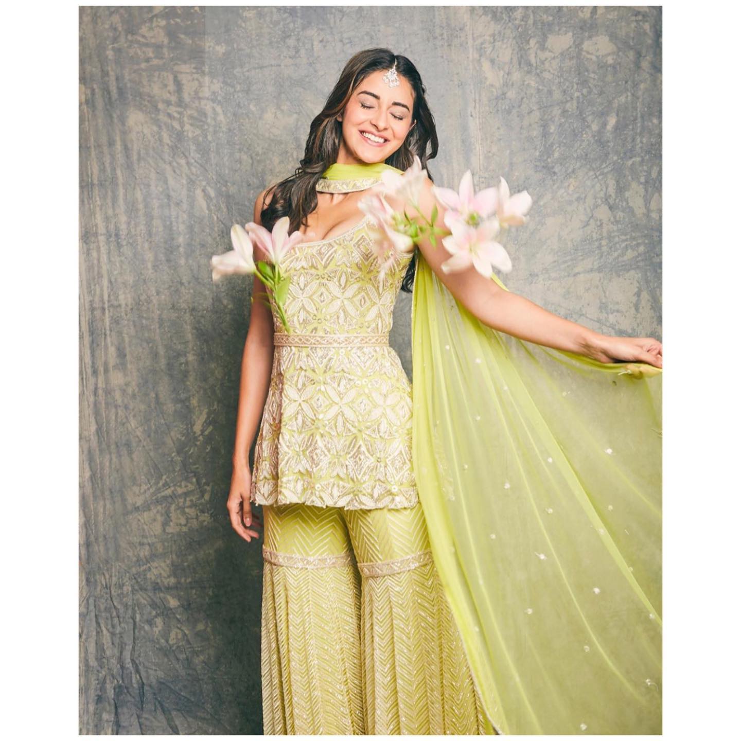 The ideal pick for a diwali celebration, ananya Panday's gorgeous green sharara set exuded big festive feelings. Flowy sharara leggings provided a sense of elegance to the ensemble, which included elaborate embroidery and a floral-patterned blouse. The Call Me Bae actress added a festive touch by draping a similar green dupatta to finish the desi ensemble.