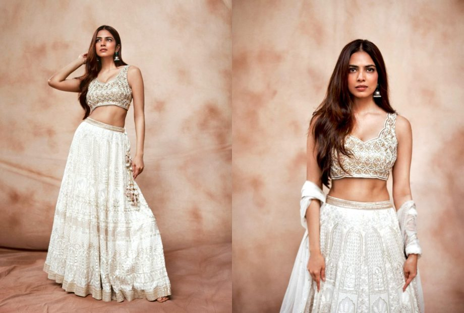 Malavika Mohanan chooses to dress simply in a white lehenga with a deep-necked top and a lot of golden embroidery. The rich decorations on the blouse are complemented by the smooth golden touch of the skirt. Her alluring appearance is enhanced by her impressive abs and white pallu. Her outfit is finished with long, middle-parted hair and minimalist jewelry, including two golden jhumkas. Her contouring, brown lipstick, and flawlessly applied eyeliner create a subtle yet gorgeous look.