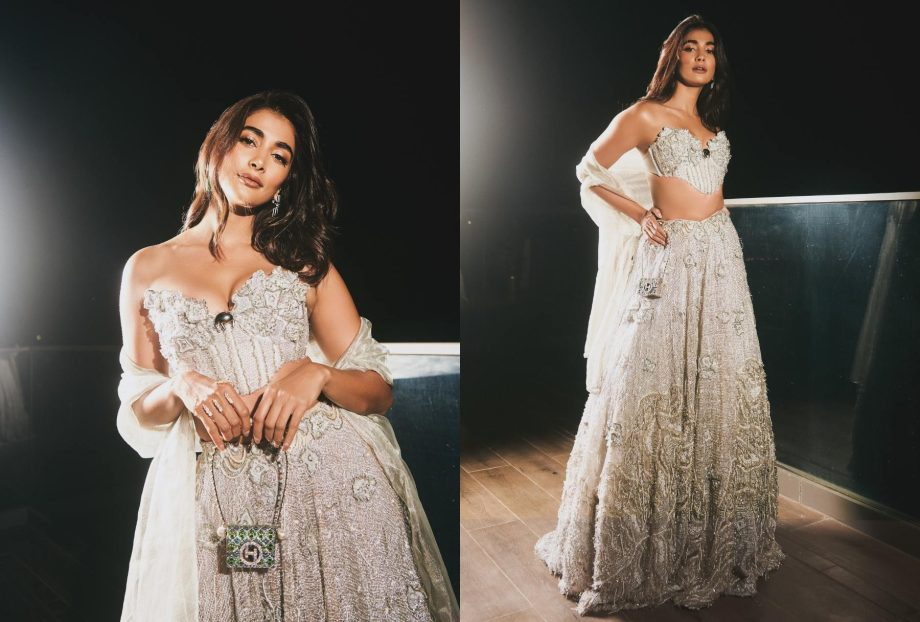 Pooja Hegde looks lovely in a silver lehenga with exquisite embellishments and detailed stitching. The silver-hued tissue fabric used to make the A-line lehenga is richly adorned with zari embroidery, stonework, and crystals. Her ensemble is enhanced with a seductive bustier style, strapless top, and matching tissue dupatta. Strappy heels, a stunning four-finger diamond ring, and emerald and Kundan earrings complete Pooja's ensemble. Her striking appearance is finished with a taupe lip hue, sparkly silver eyeshadow, luminous makeup, and a blowout haircut reminiscent of the 1990s.Malavika Mohanan's White Elegance