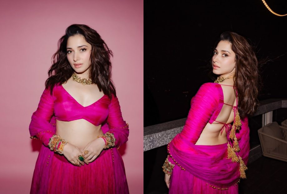 In a rani pink lehenga choli made of ruched art silk fabric, tamannaah bhatia radiates ethnic style. Her waist is emphasized by the lehenga's narrow belt design, which flows into a full skirt. Elegance is added with a matching cropped Sabyasachi-cut blouse with full-length churidar sleeves. Tamannaah's appearance is enhanced with a striking ancient gold jade necklace, kundan work, encrusted pearls, stacked jade bracelets, and cocktail rings with emerald and gold kundan work. Her peachy-nude makeup and salon-style blowout go well with her ensemble.Pooja Hegde's silver Splendor