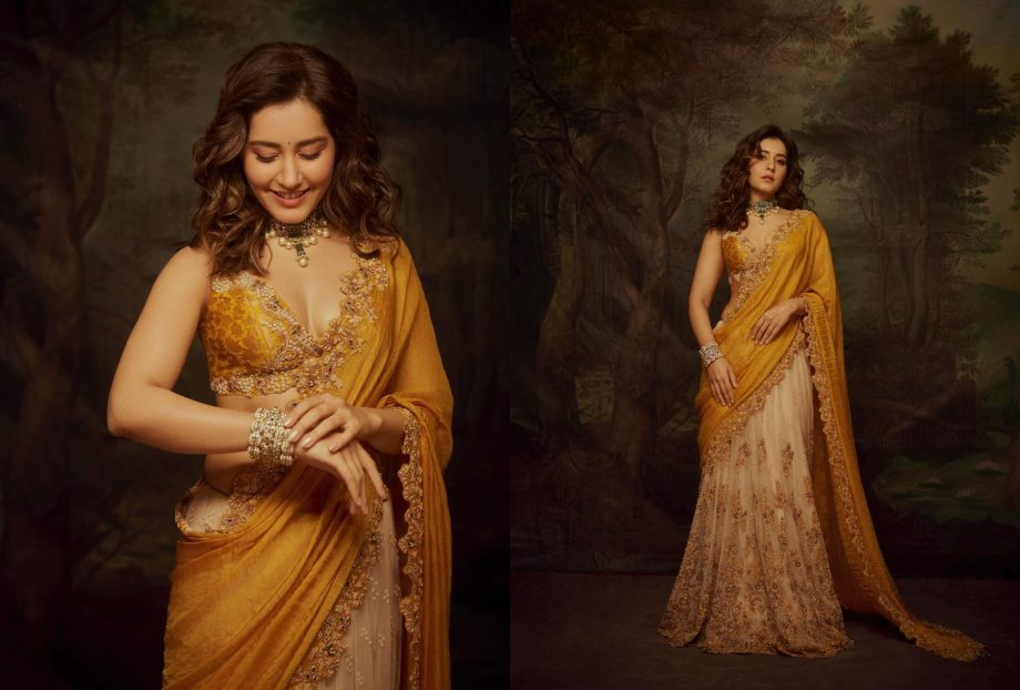 Raashii Khanna's vivid, brilliant yellow saree and matching sleeveless top kick off the holiday fashion parade. The saree and blouse borders are embellished with delicate floral threadwork, and the deep-neck blouse is complemented by a gorgeous heavy neckpiece with a green-white stone motif. Her glowing look is finished with a wide bangle and glossy makeup that includes eyeliner, mascara, pink cheek highlights, and a green bindi.