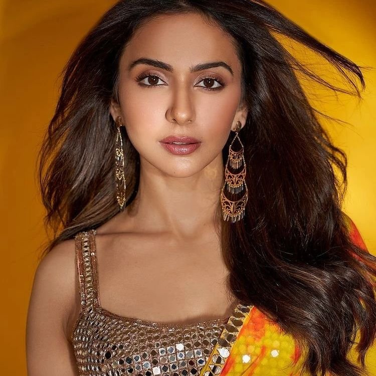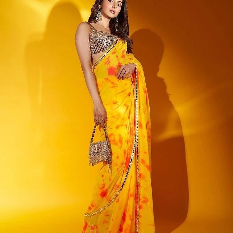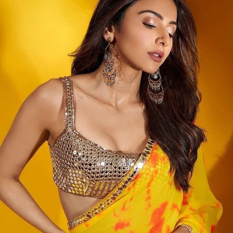 rakul preet singh recently turned heads with her stunning appearance in a deep yellow saree adorned with delicate mirror work along the border, perfectly complemented by a strappy blouse. The vibrant yellow hue of the saree radiated warmth and elegance, making it an ideal choice for festive and wedding occasions.