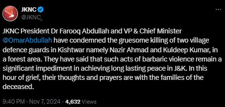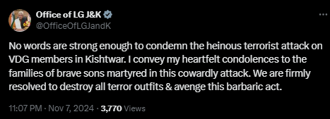 "No words are strong enough to condemn the heinous terrorist attack on VDG members in Kishtwar. I convey my heartfelt condolences to the families of brave sons martyred in this cowardly attack. We are firmly resolved to destroy all terror outfits & avenge this barbaric act," Lt governor posted.