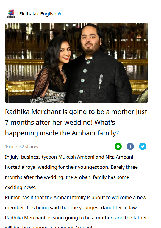 radhika may be pregnant. But all of this is only conjecture. The kid is expected to be due shortly, probably in February, according to rumors. There are also reports that all of this is purely false information, even though the Ambani family has not acknowledged any such news.