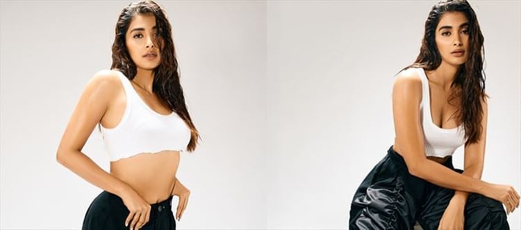 pooja hegde captured the attention of fans with her stunning look, donning a chic white crop top that highlights her well-toned physique. Known for her impeccable