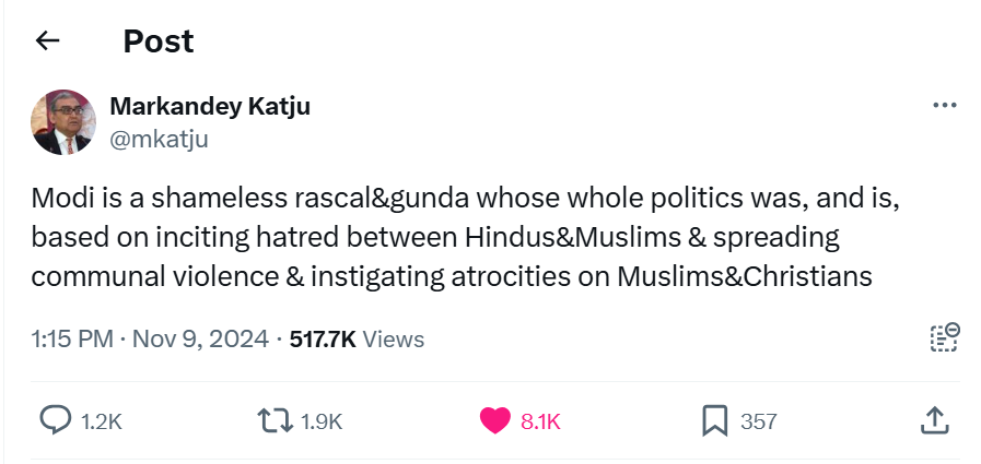 Former supreme court judge Markandey Katju's tweet about prime minister Narendra Modi stirred significant discourse within india, highlighting the polarized nature of indian politics. Katju’s comments, which label Modi as a “shameless rascal” and accuse him of inciting communal hatred, touch on the deeply sensitive topic of religious division in India.