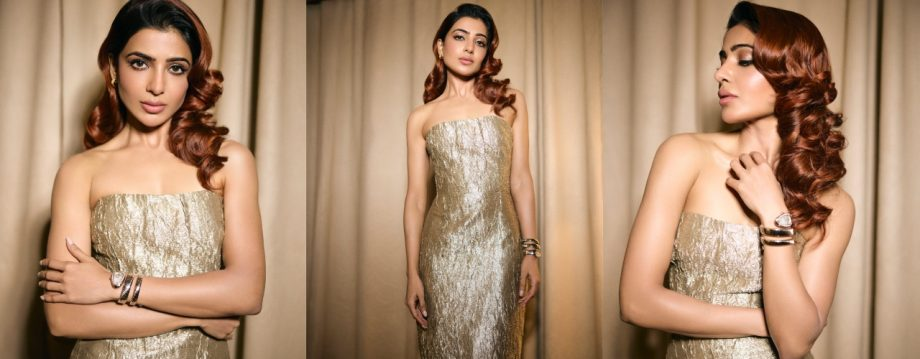 Samantha Ruth Prabhu shone in a gorgeous golden off-the-shoulder dress with a foil paper print pattern that gave her appearance a distinctive texture and shimmering reflection. Her glowing skin was highlighted by the metallic color, and the off-the-shoulder design added a sophisticated touch. She paired her outfit with a bracelet-style