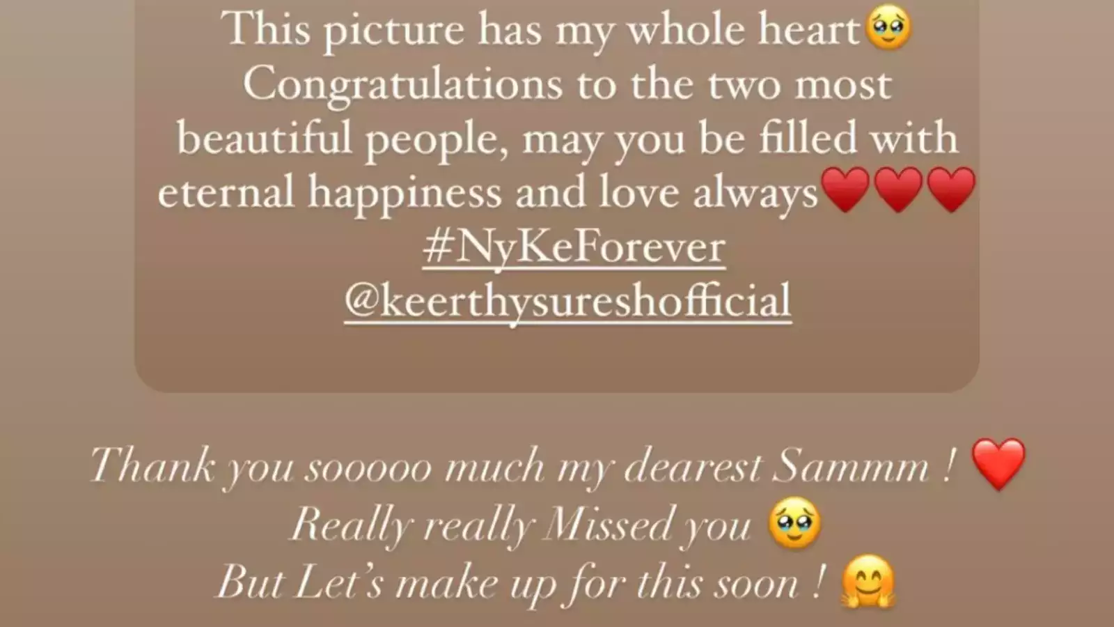 Samantha shared Keerthy's post on her instagram Stories and wrote in the caption: “The picture has my whole heart. Congratulations to the most beautiful people, may you be filled with eternal happiness and love always (red heart emoticons) #NyKeforever.” Because of previous obligations, samantha Ruth Prabhu was unable to attend the wedding. samantha was told by Keerthy suresh that she missed her during the wedding. "Thank you so much, my dear sam," she said on social media. I missed you terribly. However, let's quickly make up for this.
