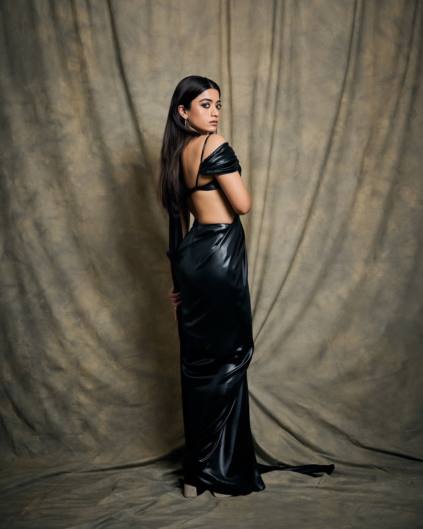 rashmika is shown in the photos radiating confidence and elegance. She looked stunning as ever thanks to the drape, a matching shirt with a sweetheart neckline, and the iconic black Nucleus belt. Minimal glitz, drop earrings, and straight hair that was left open with a few strands falling down her shoulders completed her ensemble.
