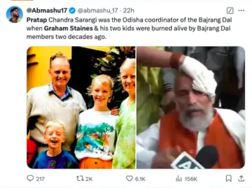 Ajmal Abbas, the chief sub editor of IndiaToday, implied that Sarangi was also implicated in the murder as he had a Bajrang Dal office at the time Staines and his boys were burned. "This guy, Pratap Sarangi, was the local Bajrang Dal chief when the outfit burnt alive Australian Christian missionary Graham Staines and his family in odisha in 1999," abbas wrote.