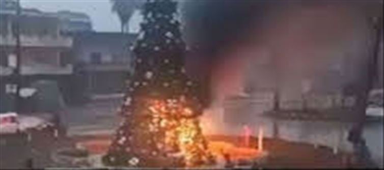 A christmas tree was set on fire in syria, sparking protests and demands that the country's new Islamist government take action to safeguard minorities. The tree was burning in the central Syrian town of Suqaylabiyah, which has a Christian majority, according to a social media video.
