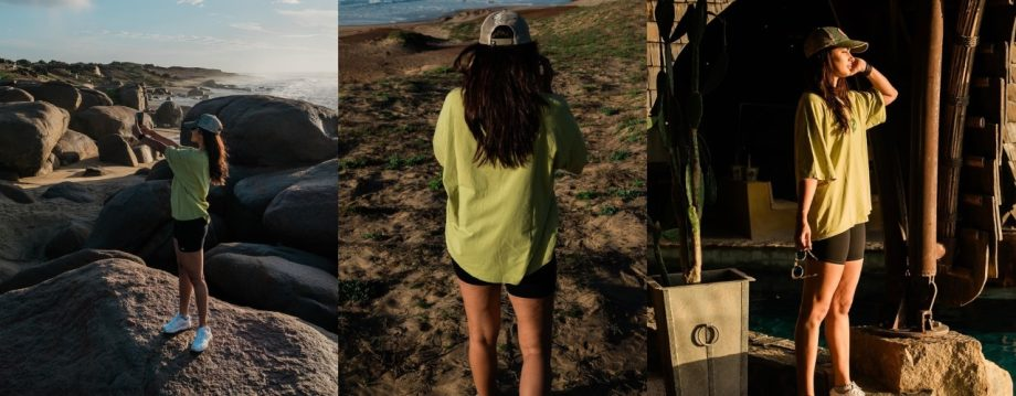 A picture taken in the sun on a rocky outcrop while wearing black shorts and a breezy green t-shirt