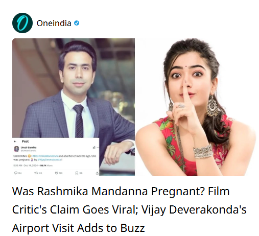 The tweet, shared by a worthless self-proclaimed film critic Umair Sandhu on december 14, 2024, read: "SHOCKING : #RashmikaMandanna did abortion 2 months ago. She was pregnant by #VijayDeverakonda!," accompanied by an intriguing series of emojis. rashmika Mandanna's name and a provocative emblem were added in the message, followed by Vijay Deverakonda's, sparking a flurry of rumors regarding their purported participation in a personal problem. The tweet was immediately analyzed by fans and followers, who made comparisons between the two celebrities.