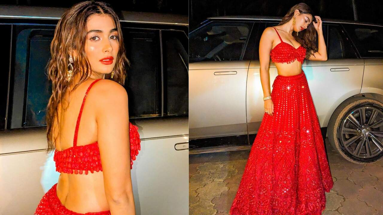 Wearing a brilliant red Arpita Mehta lehenga, the Kisi Ka Bhai Kisi Ki jaan diva turned the town crimson for the wedding season. The striking bralette blouse included fringes and exquisite mirror embroidery that produced a trompe l'oeil pouring impression. With feathery lashes, dewy, shimmering skin, and glossy red lips, pooja channeled her inner Little red Riding Hood and slayed the glam for this look.