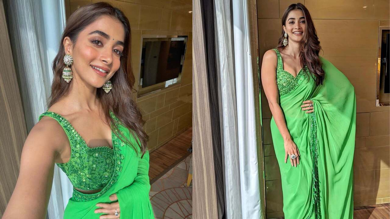 Summertime fantasies come true with Pooja's parrot green saree. The actor from Cirkus posted pictures of herself looking stunning in an Arpita Mehta saree with fringes in a bright green color. The blouse is what completes the ensemble, even though the solid saree had fringe decoration on the pallu. The parrot green blouse has a beautiful appeal that is true to traditional workmanship since it is hand-embroidered with cut dana and mirror sequin work.