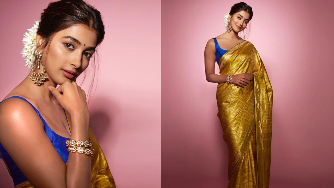 Pooja demonstrates how to use color blocking to create a stylish ethnic style while wearing this golden raw Mango saree. Her luxurious mustard yellow silk sari with chevron-patterned gold zari embroidery. The sleeveless silk blouse in a vivid shade of cobalt blue provides a stunning contrast that instantly elevates the saree.