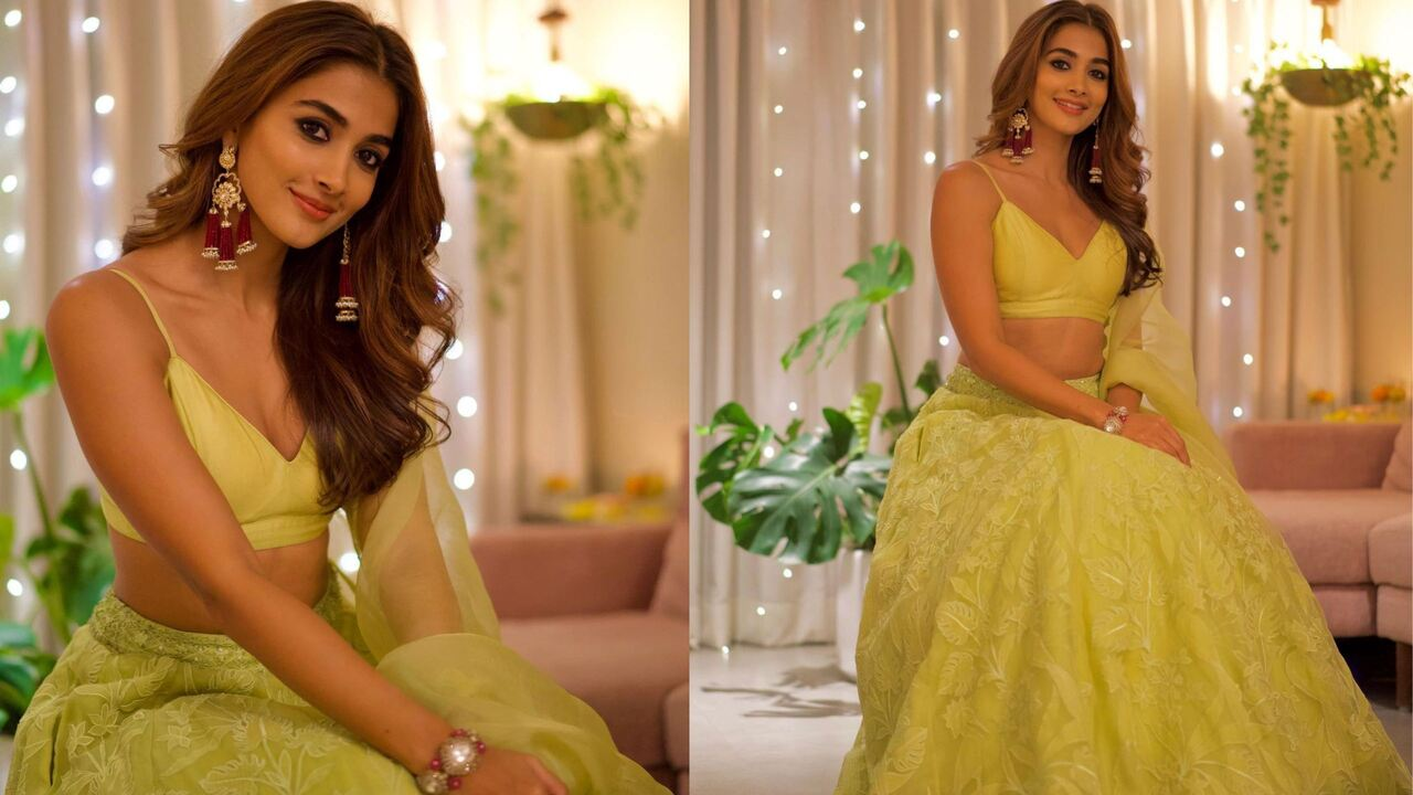 Pooja used Anita Dongre's Wild Heron lehenga set in lime green to provide a new twist to the festive attire. The basic lime green strappy-sleeved shirt with a V-neckline is worn with the billowing silk patchwork skirt and dupatta. The housefull 4 actress added a polki bracelet and dangling ruby statement earrings to complete the summertime ethnic ensemble.