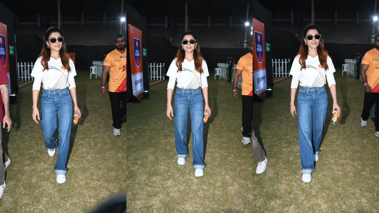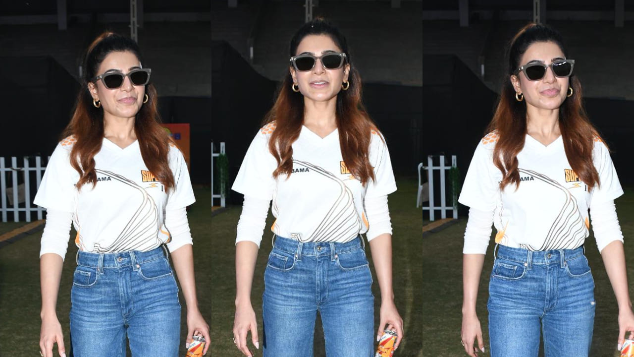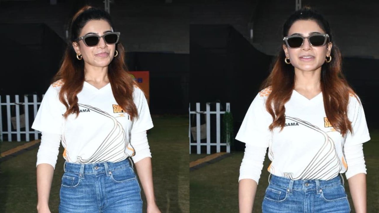Samantha Ruth Prabhu accessorized her top with blue denim trousers, giving her look a more laid-back attitude. A carefree yet stylish appearance was guaranteed by the high-waist accents and loose fit. The actress chose to tuck in her top for a more put-together look. Her accessories were appropriate—casual and understated. She wore rings and hoop earrings with golden accents, which was the perfect example of a minimalist outfit. Finally, her sunglasses gave her a carefree look the perfect amount of flair.