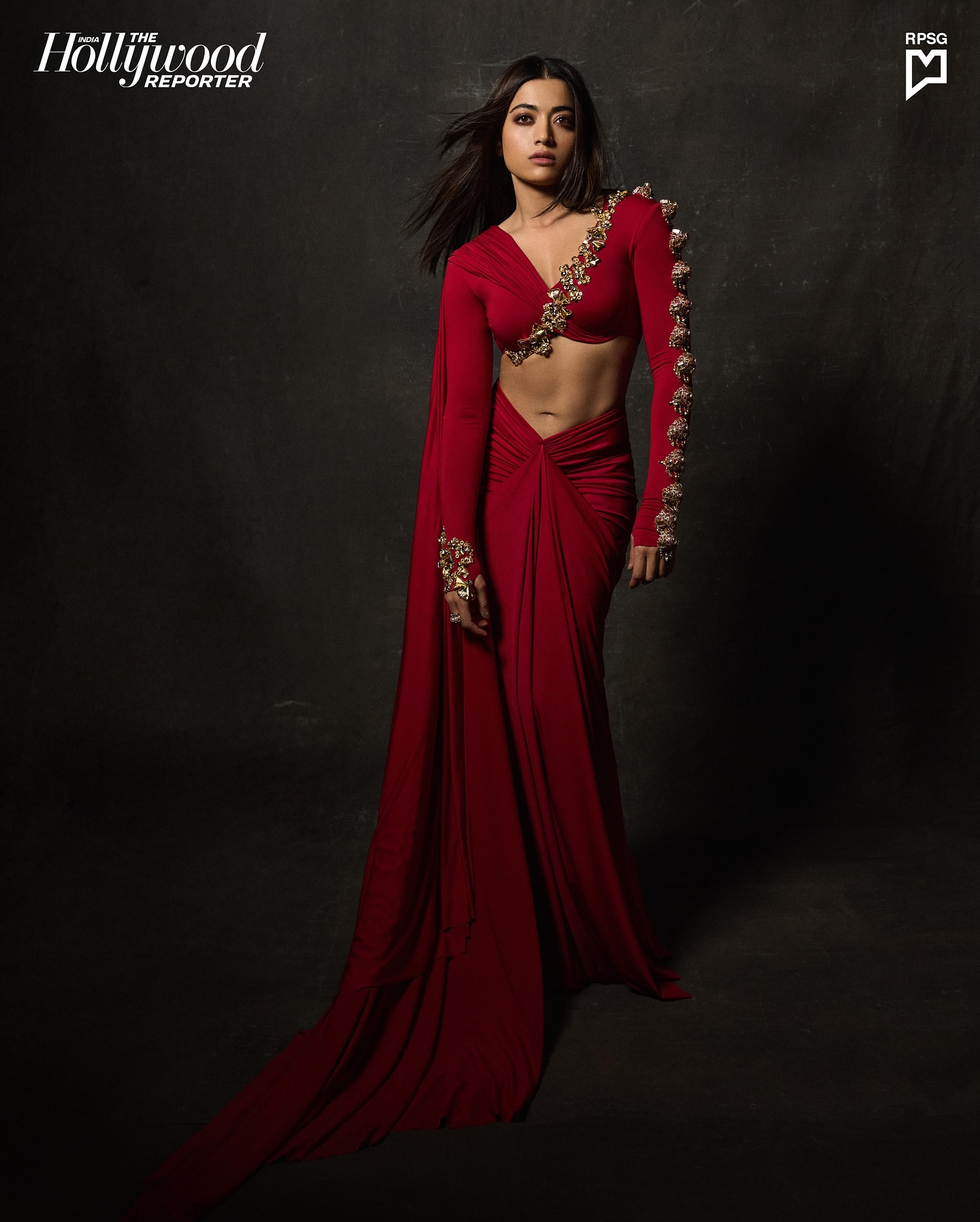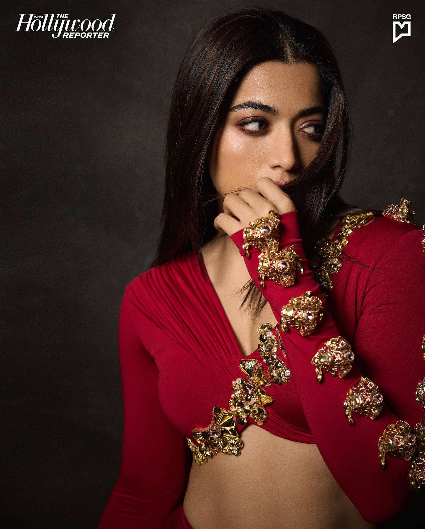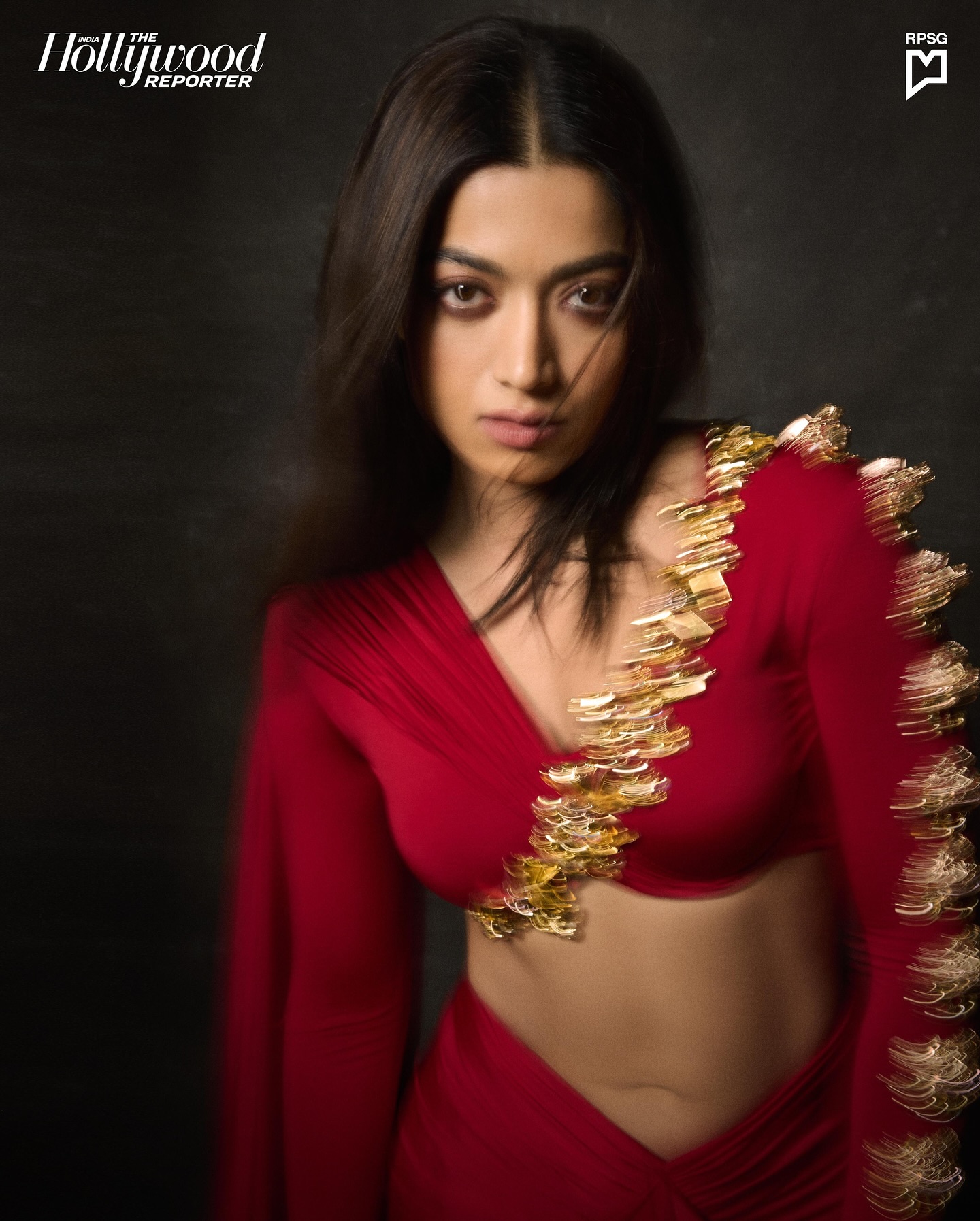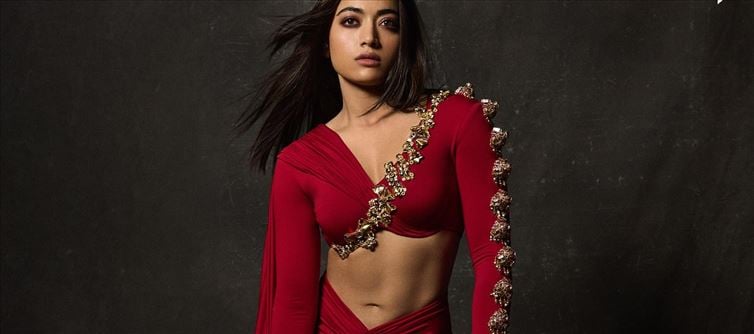 Rashmika's crowning beauty was a sleek, center-parted, open-haired appearance that was created by hair stylist Sourav Roy. With her overall bronzed skin, bushy brows, a shimmering chrome eye shadow look, a lot of mascara to add drama to her lashes, and a muted rose nude lip color to add the ideal finishing touch, celebrity makeup artist tanvi Chemburkar added the ideal glam strokes to match the hairstyle. In her avatar dressed in a saree, rashmika mandanna turned the town red.